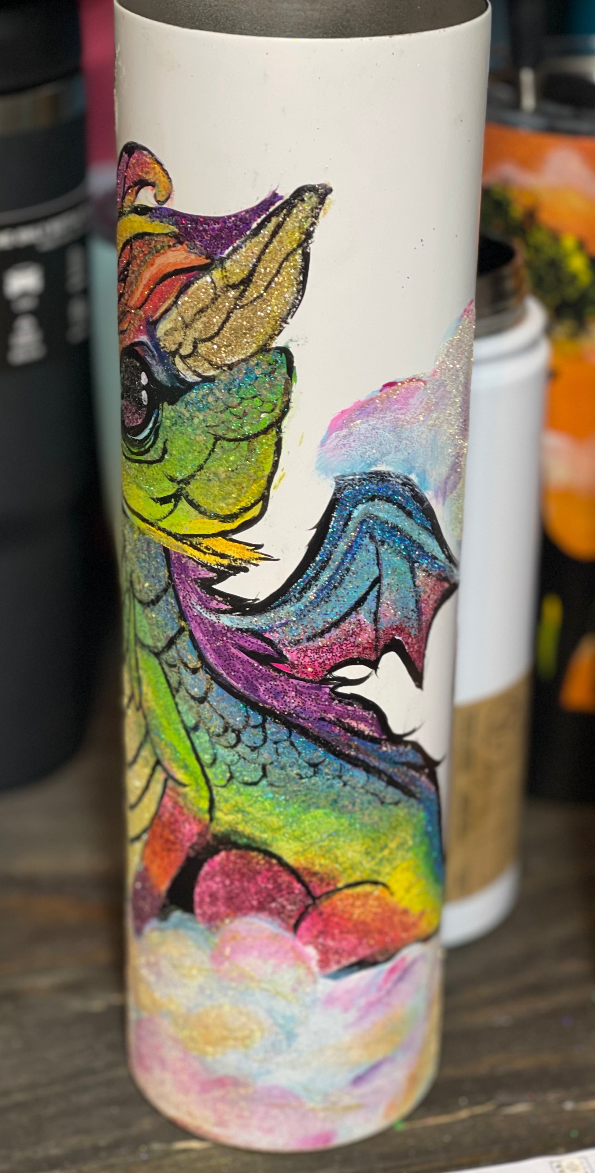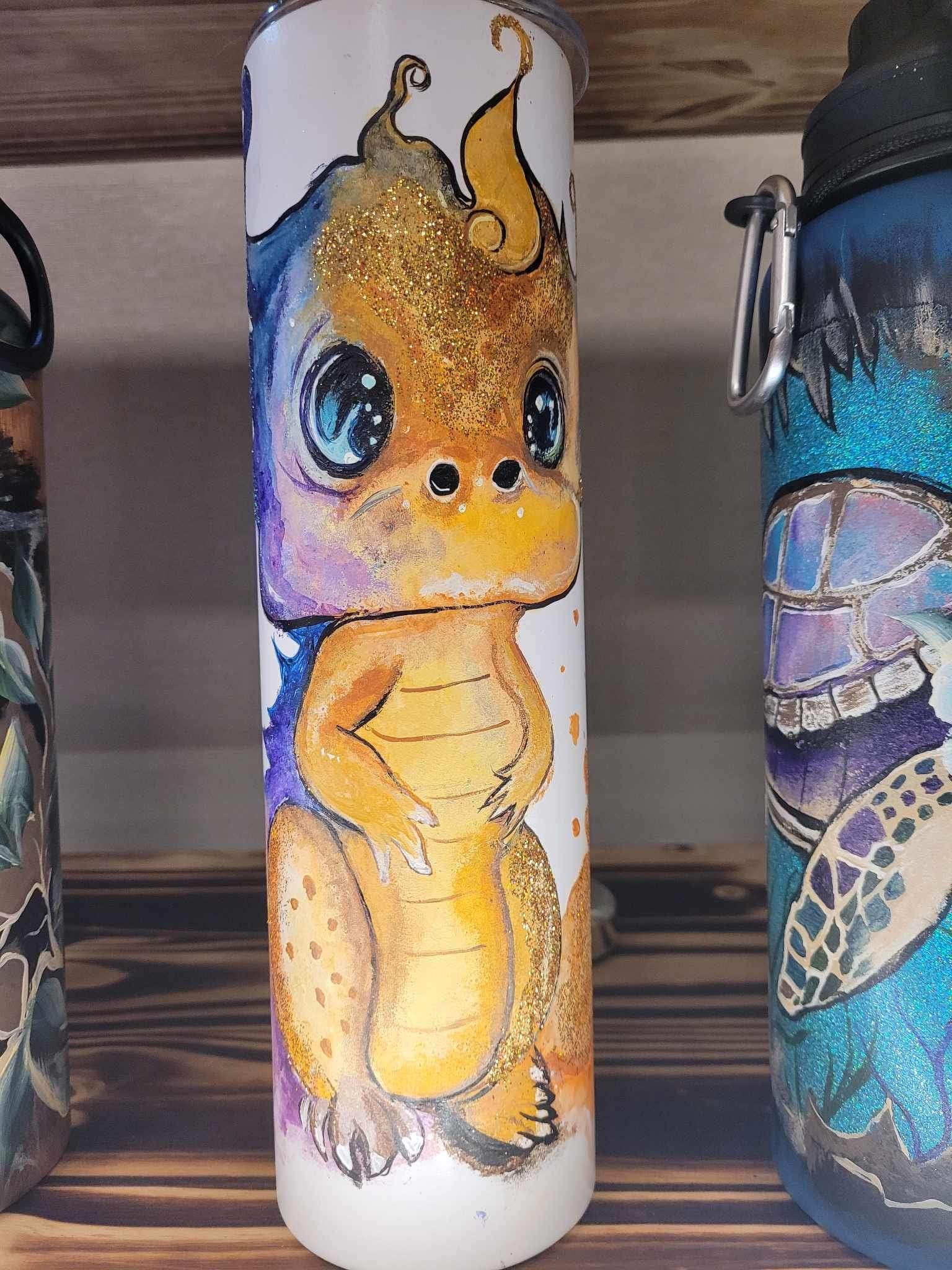 Introducing our hand-painted baby Dragon tumbler, perfect for any dragon lover. This dishwasher-safe tumbler features cute glitter accents, making it a unique and eye-catching addition to your drinkware collection. Bring a touch of magic to your everyday routine with our Cute Baby Dragon tumbler.